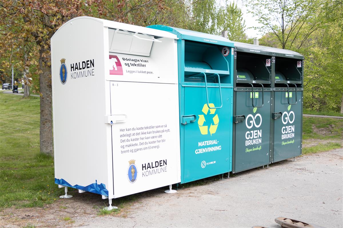 På miljøstasjonene vil du framover finne tre forskjellige dunker som er beregnet på klær og andre tekstiler. Det er to grønne dunker og en hvit. De grønne dunkene eies av NLM som har avtale med kommunen. De hvite dunkene eies av Halden kommune og er tydelig merket med kommunens logo.