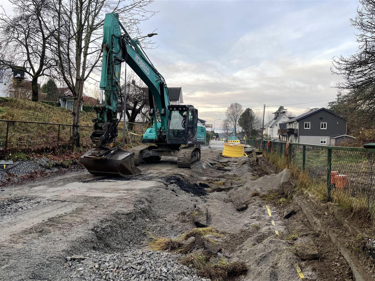- Hvis ikke det blir så kaldt frem mot jul, så håper vi å få lagt et første asfaltlag før nyttår. Før vi åpner veien vil vi også sette ut all kantstein langs veien, fordi det gjør det sikrere å jobbe nær trafikken. Vi kommer trolig til å fortsette jobben med oppbygging av fortau etter at veien har åpnet, sier Larsen.