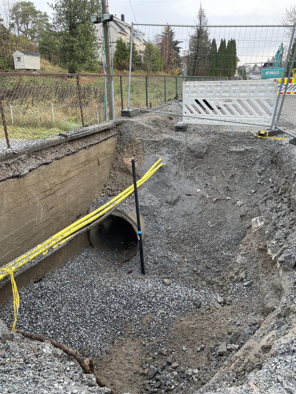 Det store betongrøret du ser her, er det gamle avløpsrøret som skal fjernes. Dette røret har tidvis vært fylt med vann mens gravearbeidene har pågått i GImleveien.