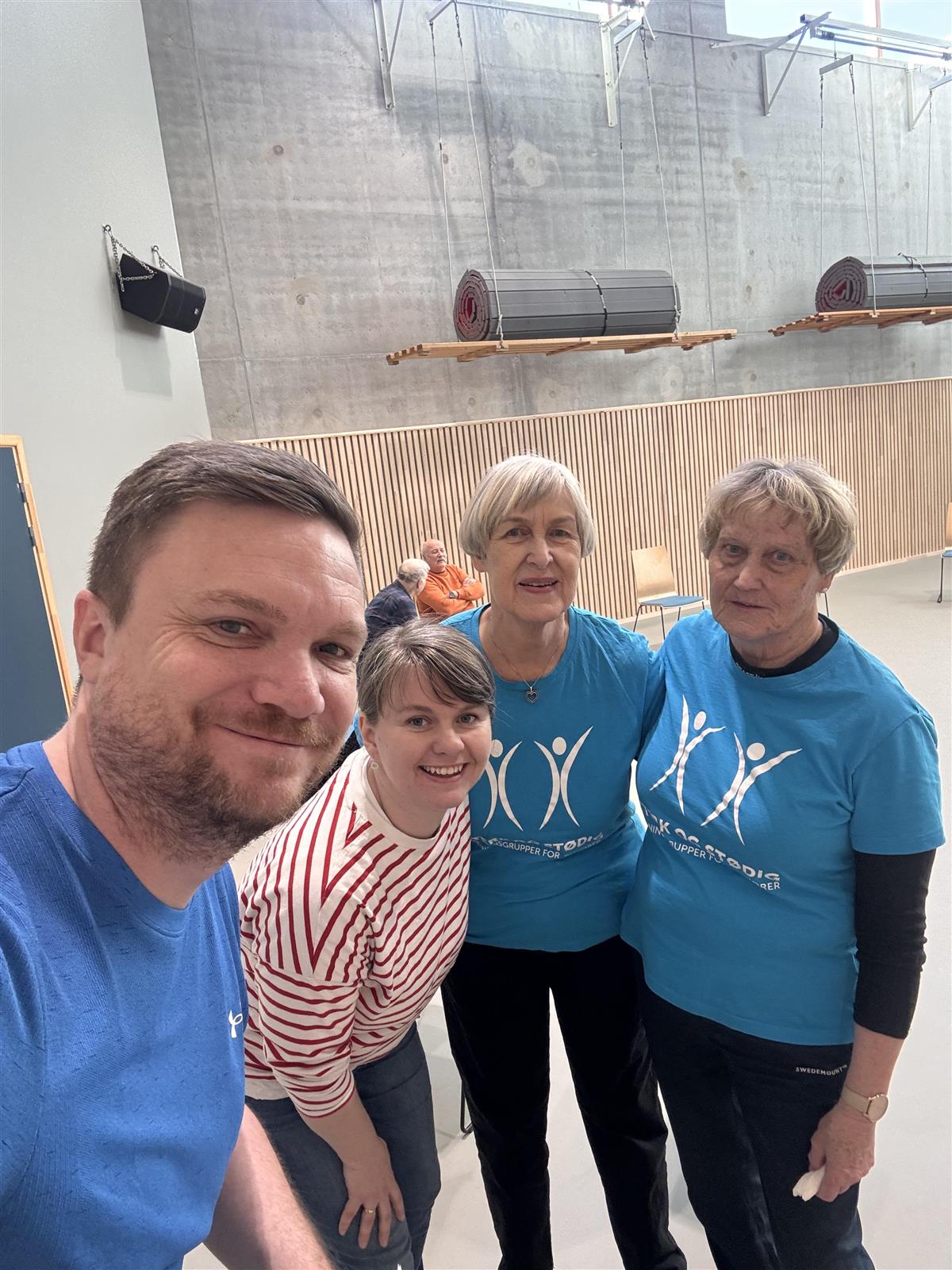 Direktør helse Martin Ekran prøver treningstilbudet Sterk og stødig sammen med Martine Andreassen, Berit Signebøen og Ingebjørg Samuelsson.