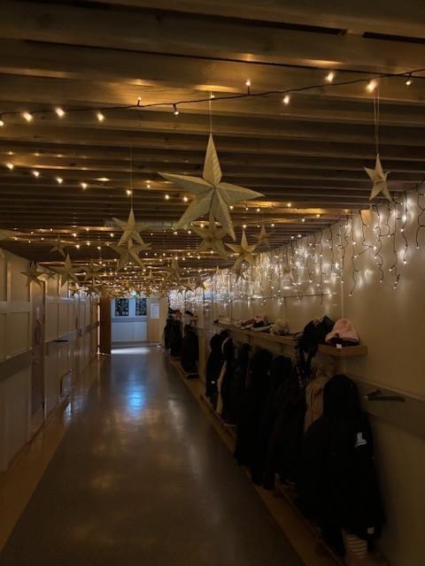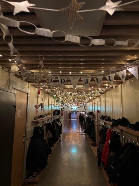 Den 1. desember åpnet vi offisielt julen på Berg skole med en stemningsfull markering. Julegangen for 5.-7. trinn ble pyntet med farger, lys, lenker, stjerner, hjerter og julekuler, og det var en glede å se den vakre dekorasjonen som skapte en magisk atmosfære for både elever og lærere.